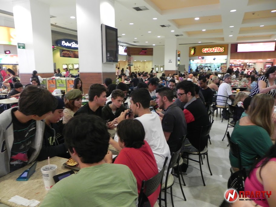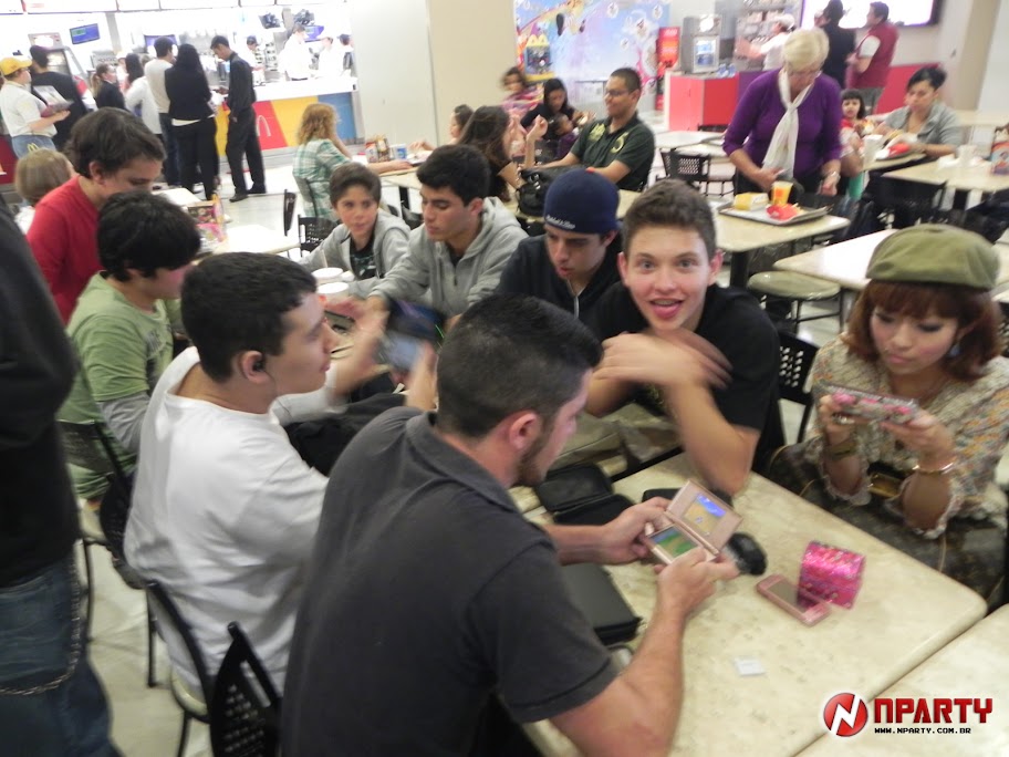 O encontro se iniciou as 2 da tarde. Não precisei procurar muito pelas pessoas... Bastou olhar a volta na praça de alimentação para ver um grupo de jogadores agrupados, com 3DS's na mão e se divertindo. Alguns dos presentes já eram conhecidos dos encontros da N-Party em eventos, além dos presentes membros ramelões do grupo (Né Lobim ? Né Jomon ? Osmar, David ? ).